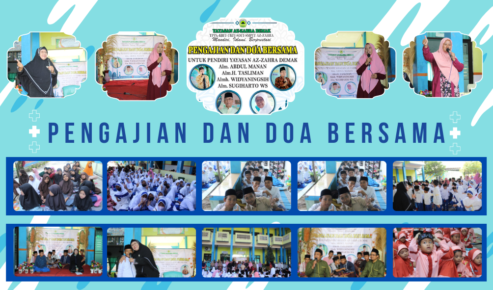 Sabtu, 13 Agustus 2022 | Yayasan Az-Zahra Demak melaksanakan kegiatan pengajian dan doa bersama untuk Pendiri Yayasan Az-Zahra Demak yang telah wafat diantaranya; Alm. Abdul Manan, Alm. H. Tasliman, Almh. Widyaningsih, Alm. Sugiharto WS. Doa bersama dipimpin oleh Bapak Bahruddin, S.Ag merupakan kepala sekolah SMPIT Az-Zahra Demak dilanjutkan dengan sambutan oleh Ibu Sadiyah, S.Pd., M.Pd.I selaku kepala sekolah SDIT Az-Zahra Demak dan Pendiri Yayasan Az-Zahra Demak. Tidak hanya itu, sambutan kedua oleh Ibu Hj. Saichat Tasliman sebagai pendiri Yayasan Az-Zahra Demak juga ikut mengisi kegiatan acaranya dengan memberikan mauidzoh hasanahnya untuk tetap menjadi anak yang sholih dan sholihah, sesuai dengan motto nya yaitu Mandiri, Islami, dan Berprestasi. Kemudian selanjutnya kegiatan santunan anak yatim, piatu, dan dhuafa berjalan dengan baik pula dengan memberikan beberapa bingkisan.